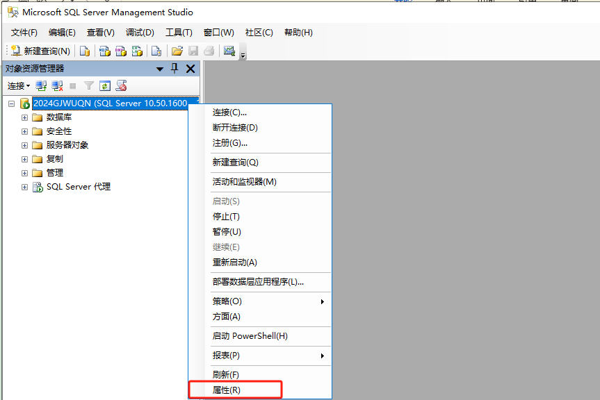 4,鼠标右键数据库服务器选择属性,进入服务器属性页面选择安全性,服务器身份验证选择SQL Server 和windows身份验证模式。