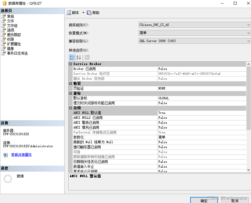 5,最后再次右键数据库QFBJZT选择“属性”,在打开的QFBJZT数据库属性页面单击“选项”标签,恢复模式后下拉菜单中选择回“完整”模式,设置好后单击“确定”按钮使设置生效即可完成收缩数据库日志文件工作。