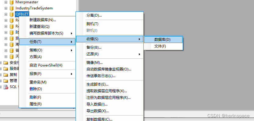 3,返回SSMS窗口,右键单击目标数据库名称QFBJZT,右键选择任务-收缩-数据库。