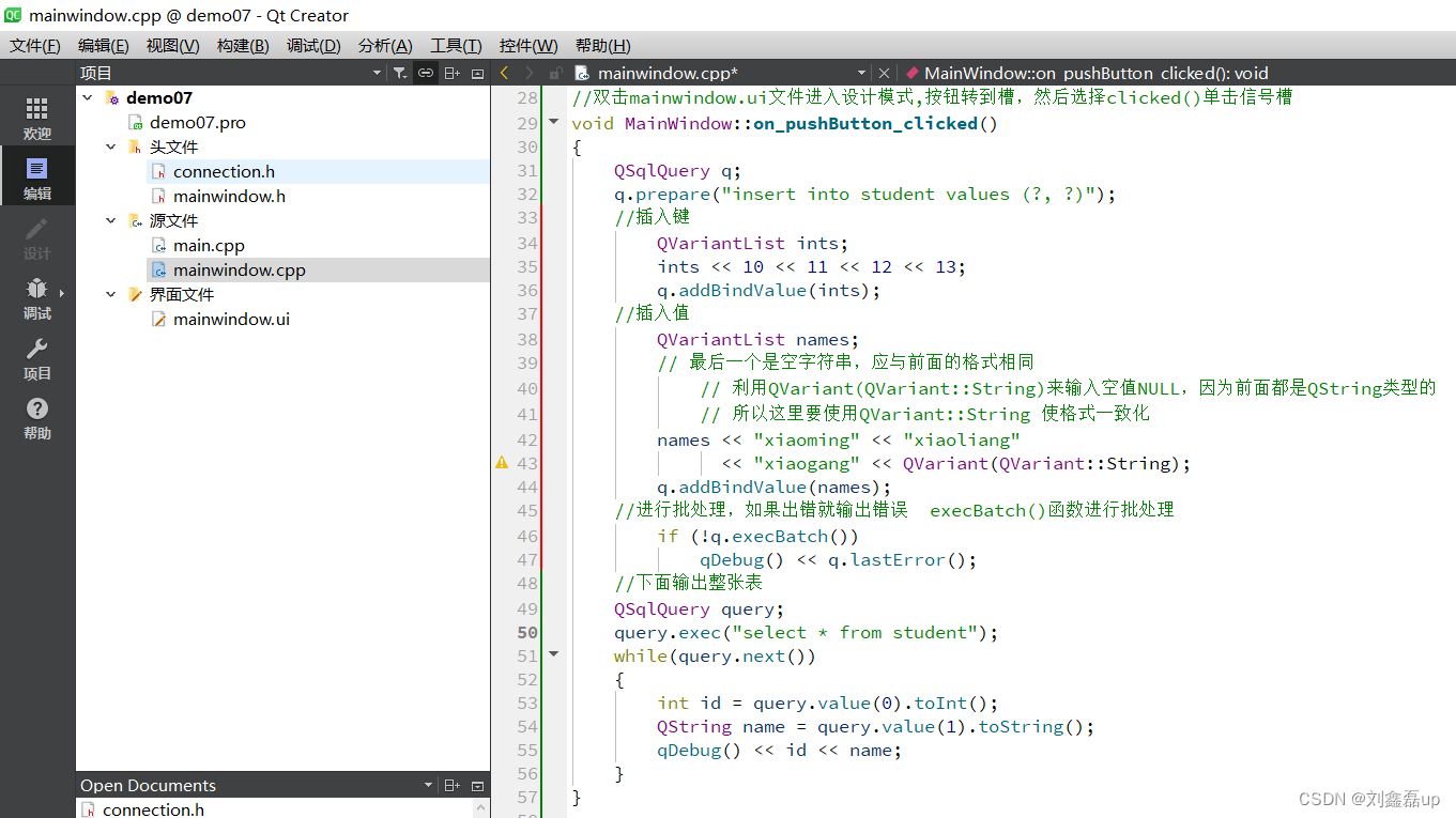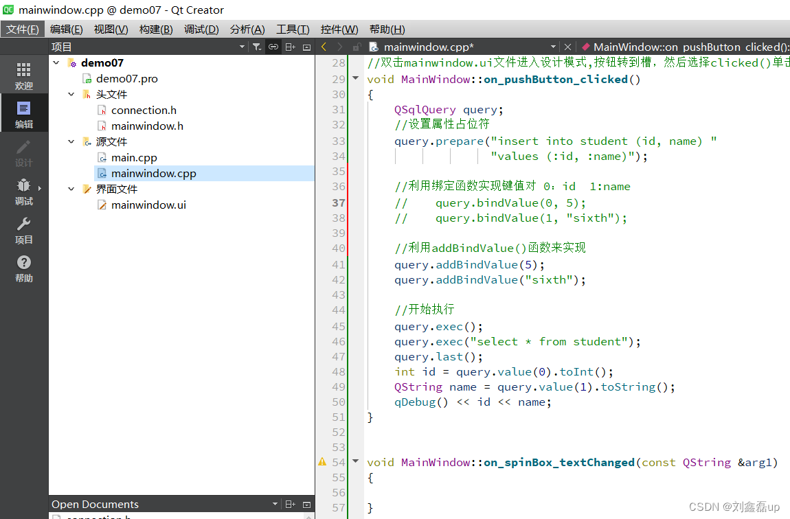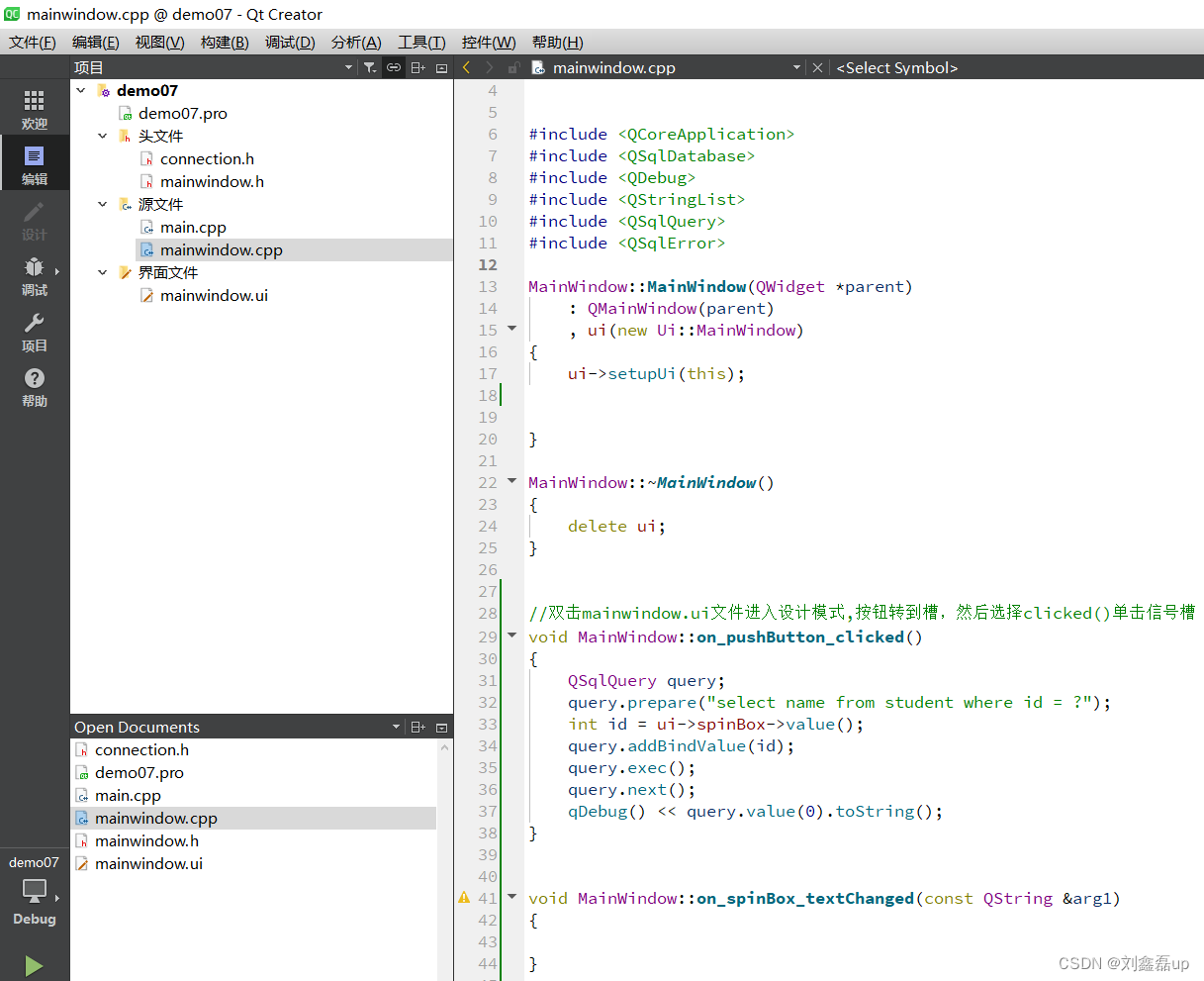 b.编辑mainwindow.ui文件添加滑动spinBox。1.5 编辑mainwindow.cpp文件编写槽函数。3.1 编辑mainwindow.cpp文件编写槽函数。c.编辑mainwindow.cpp文件编写槽函数。b.编辑mainwindow.cpp文件编写槽函数。a.编辑mainwindow.cpp文件编写槽函数。1.3 编辑main.cpp文件调用连接函数。第一种:在sql语句中使