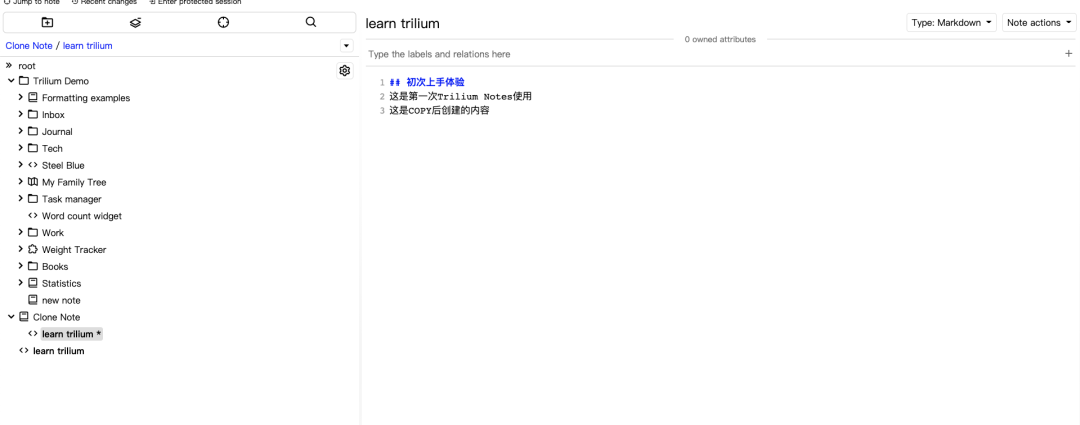 Trilium Notes的拷贝我觉得也是一个特色功能,非常便捷的拷贝,并且一个笔记修改其他的副本也可以同步更新