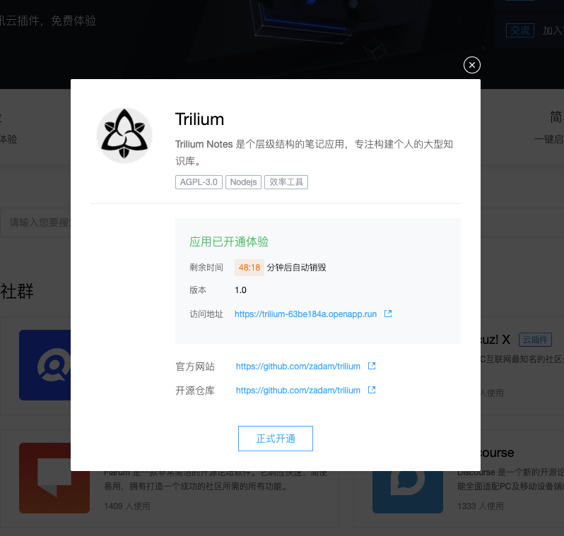 第二步:击免费体验或正式开通,点击访问链接即可访问到属于你的Trilium Notes网站
