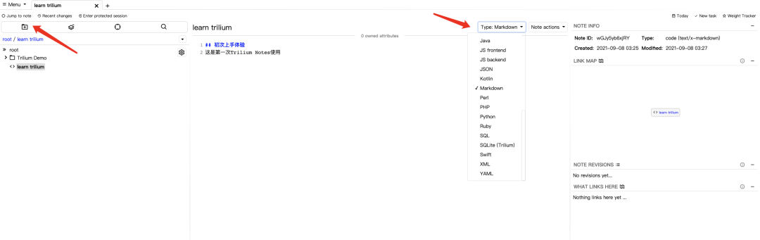 我们通过点击左边的新建笔记来创建我们的第一篇笔记,在编写笔记的时候可以选择自己想要编写的文章类型,可以看到非常多的笔记类型这里我选择的是Markdown