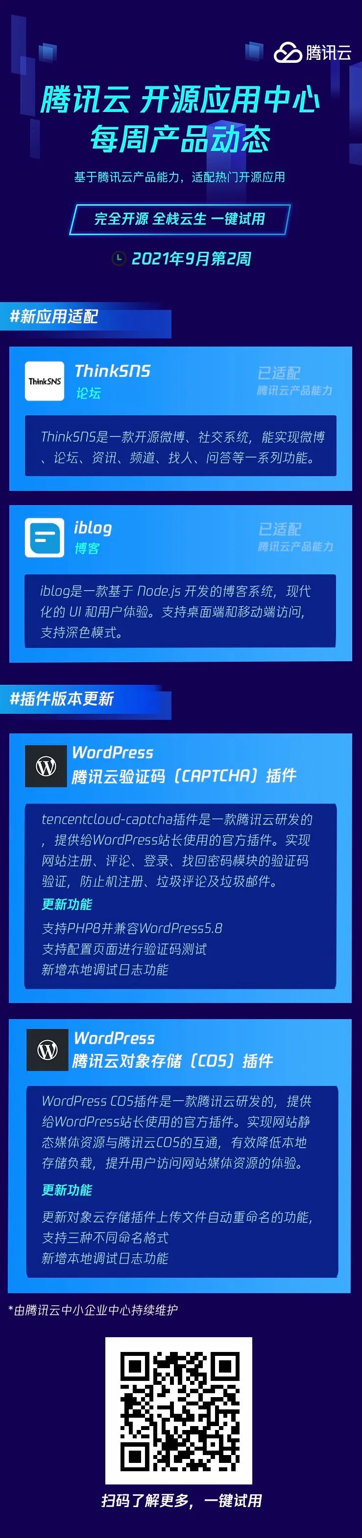 开源应用中心每周持续上新中,本周有ThinkSNS、iblog2款应用全新适配、插件更新2款腾讯云产品能力,下面一起来看看有没有合适你的应用吧!