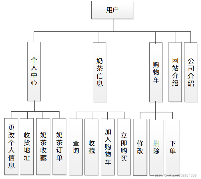 对用户具体功能的设计结果将以图4.2所示的用户功能结构图来进行体现。用户对于网上奶茶店系统操作的功能包括查看奶茶信息,购买奶茶,查看网站介绍和公司介绍,管理购物车,对奶茶订单进行查看等。