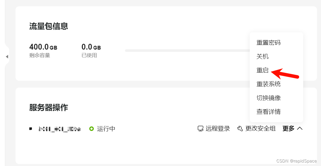 登录云服务器商的控制面板(我用的是华为云),重启云服务器。