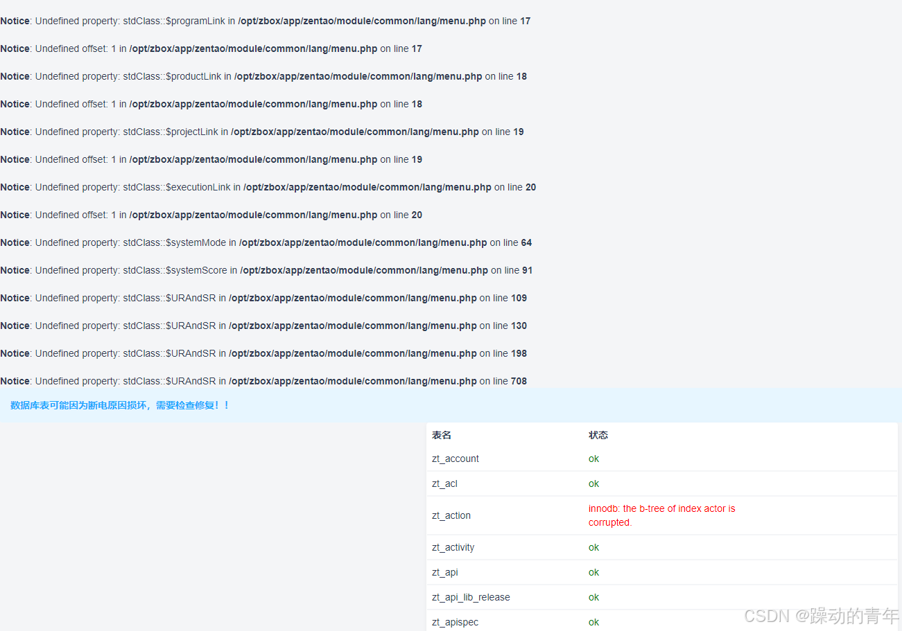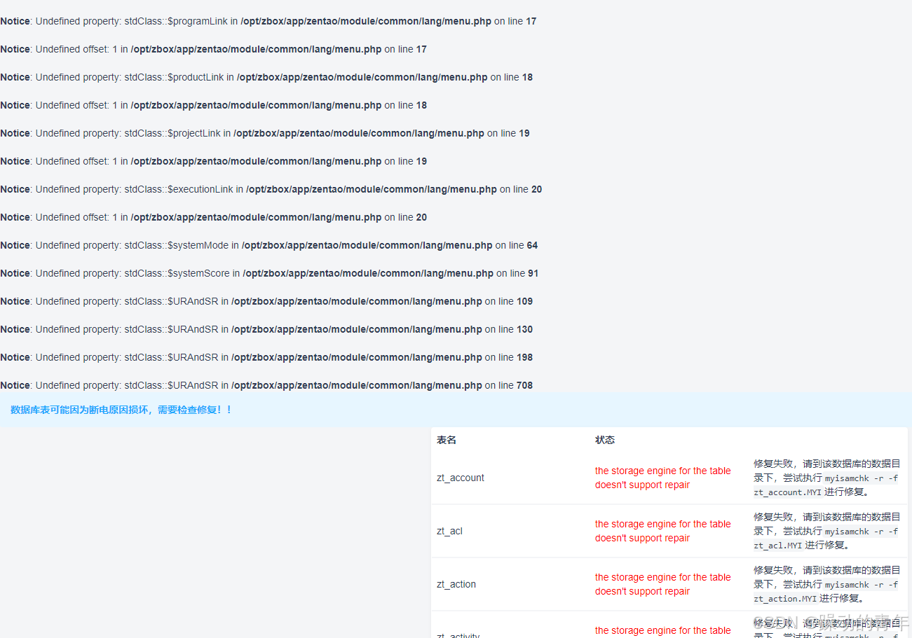 禅道服务器异常断电后,访问页面空白。数据库表可能因为断电原因损坏,需要检查修复!!