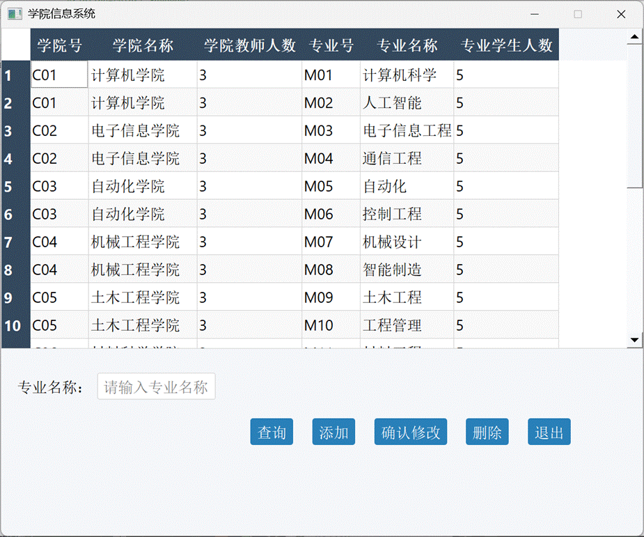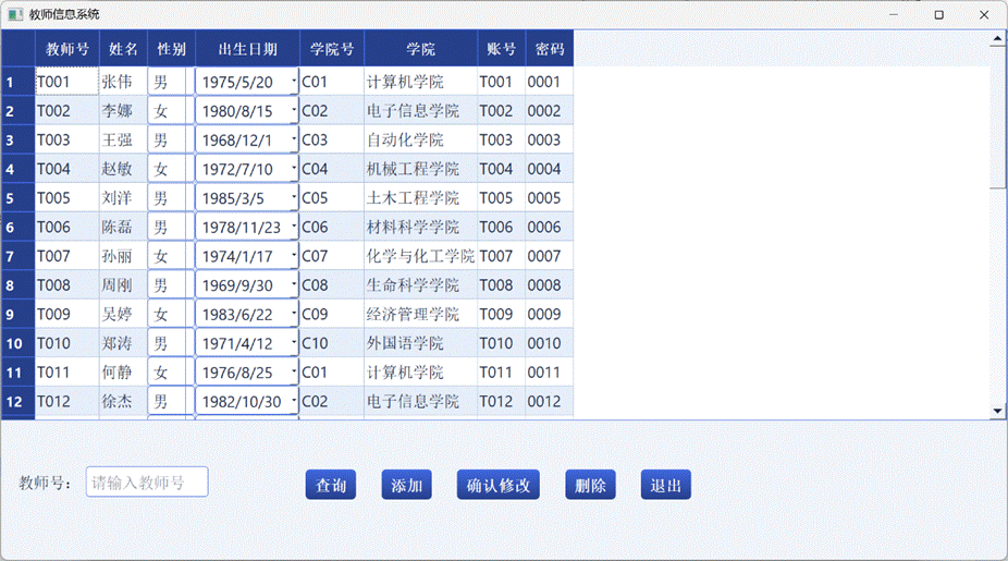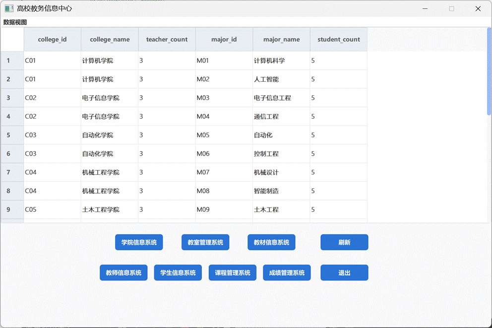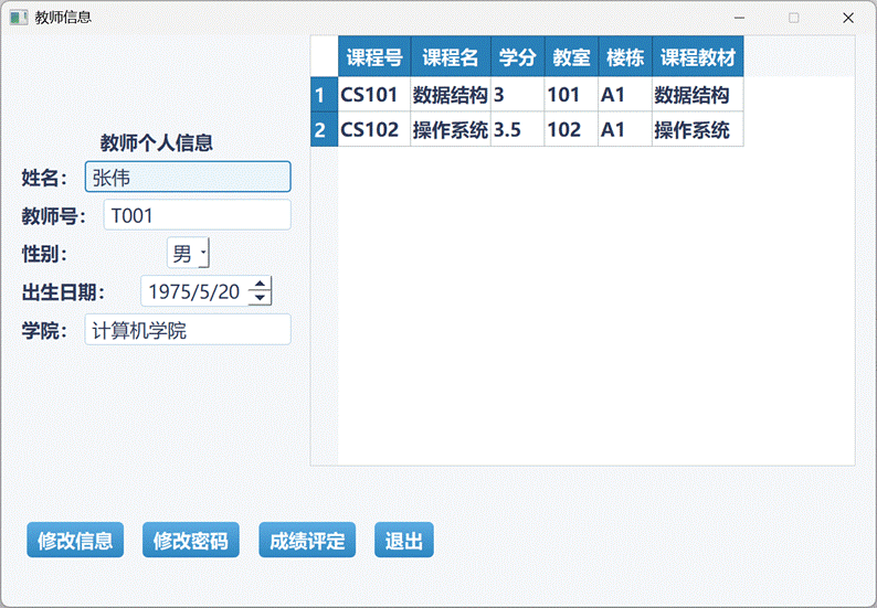 在界面结构设计上,本系统采用模块化与表格化相结合的布局模式,不同角色主界面按功能区分为信息展示区与操作控制区,配合统一风格的控件与交互按钮,确保用户在不同操作场景下能够获得清晰、连贯的视觉与操作体验。各子界面遵循“信息展示 + 功能操作”双区划分策略.