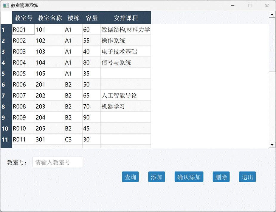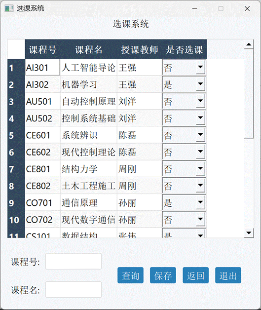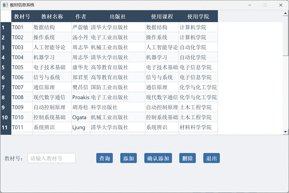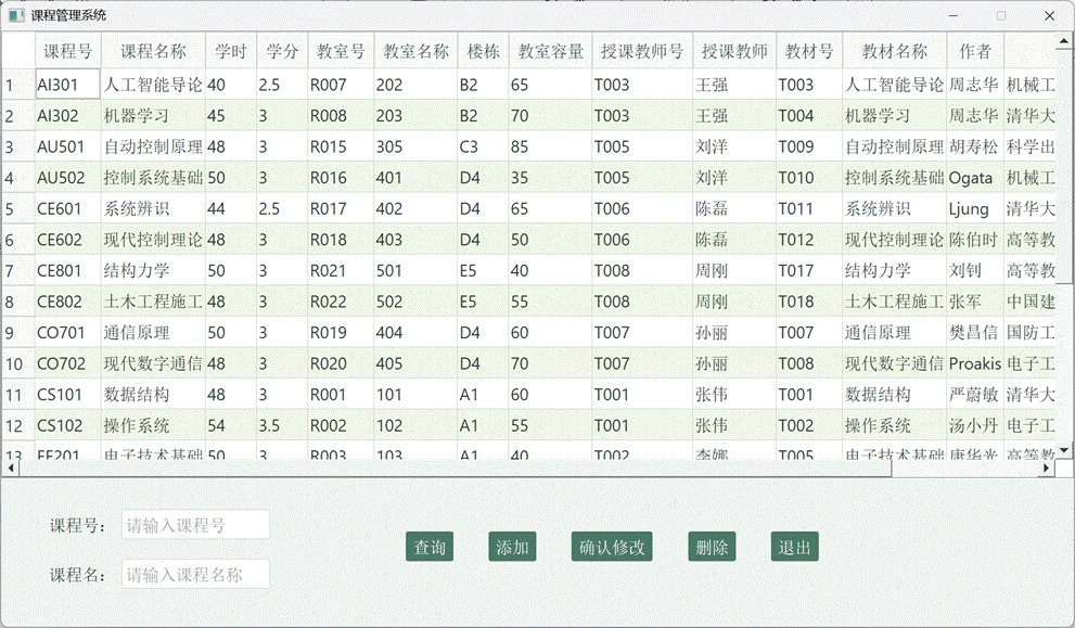 - 输入: 课程ID、名称、学时、学分、教室ID、教师ID、教材ID
