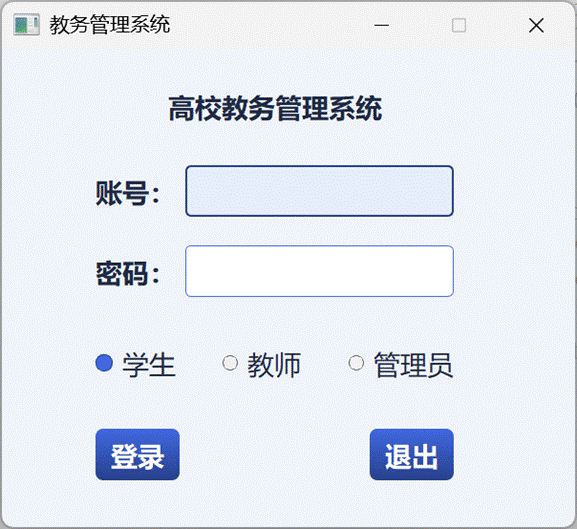 本系统的用户界面层(UI)采用 Qt Creator 集成开发环境 配合 Visual Studio 编译工具链,使用 C++ 编程语言进行开发实现。基于 Qt 框架强大的跨平台图形界面支持能力,系统实现了图形化的交互界面、响应式的控件管理机制与多角色权限视图的动态切换功能。在界面设计过程中,充分遵循多角色分离、模块划分清晰与交互逻辑一致性的设计原则。围绕功能建模中定义的各类业务操作流程,系统通过统一风格、结构分区明确的图形化界面,实现了对学生、教师与管理员三类用户的功能支持。以下从界面呈现与交互实现两方面展开描述。