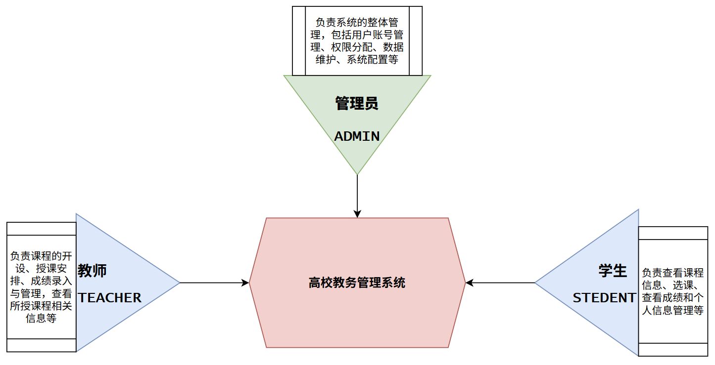 随着高校办学规模的扩大,课程设置、师生管理、选课与成绩处理等教务工作变得日益复杂。传统人工管理方式效率低下、数据易出错,亟需一个高效、安全、智能的教务管理系统来支撑教学运行。高校教务系统旨在为教务人员、教师和学生三类用户提供全面的信息管理与操作平台,实现选课、成绩管理、课程安排、教学评估等功能的信息化与自动化。管理员:负责系统的整体管理,包括用户账号管理、权限分配、数据维护、系统配置等。教师:负责