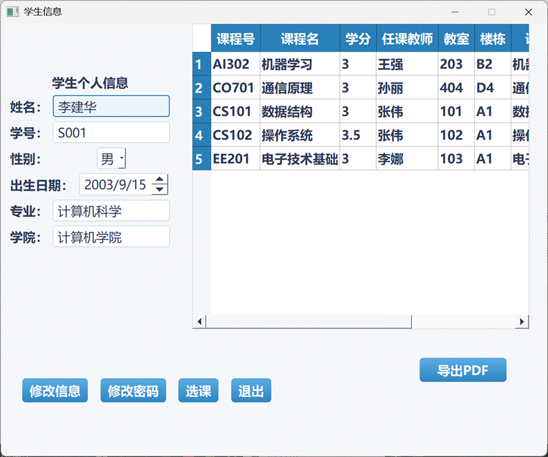 前端开发:界面开发采用 C++ 结合 Qt 框架,能够实现跨平台的图形用户界面(GUI),具有高度自定义性,适合高校终端部署需求。