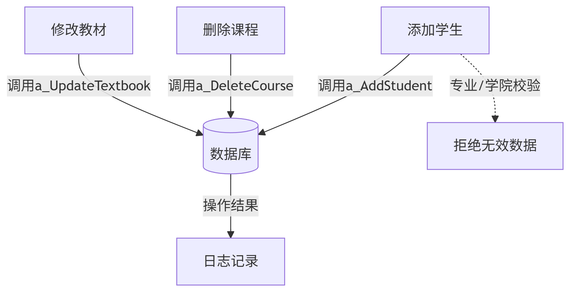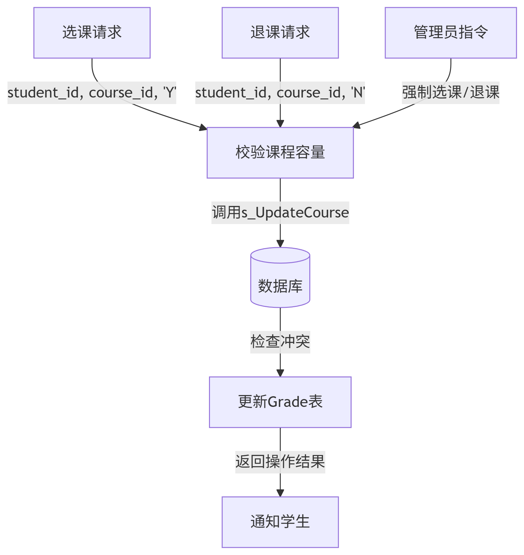 - 处理: 验证课程存在性,删除Course表记录(级联删除Grade表记录)