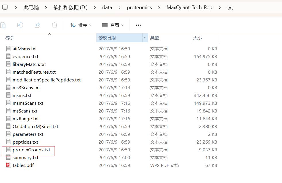 所有的鉴定及定量表格也会以txt格式保存于combine文件夹下属的txt文件夹中,其中proteinGroups.txt文件中关于蛋白的鉴定及定量信息是各类蛋白质组学研究中最常用最重要的数据。
