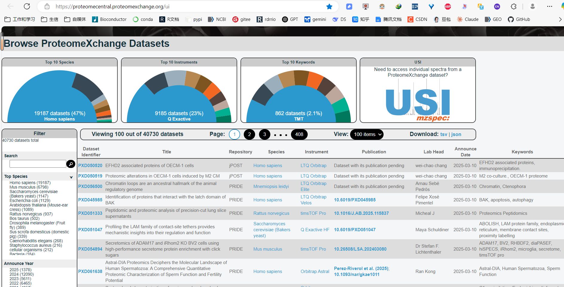 当前该数据库中已经收录了4万多个各种物种的蛋白组学数据集,数据集编号是PDX开头,类似于GEO的GSE数据集,且数据集的数量还在逐年增加。
