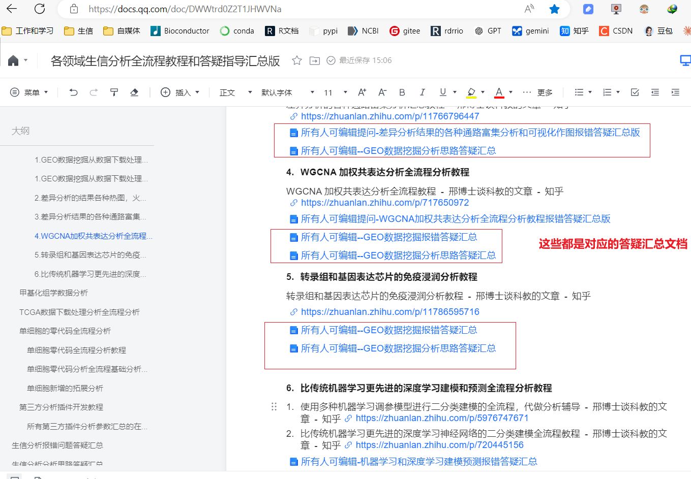这篇总的腾讯文档是各领域生信分析答疑指导汇总文档的入口,以后所有的生信分析教程资料都在这个在线word文档中就能检索到,答疑汇总也能在这个word文档中检索到,都在这个在线word文档对应的提问答疑文档文件中提问,提问的问题在文档中用红色字体显示,我答疑在文档中用黑色字体显示,提问答个疑的文档和教程的文档所有人都可编辑。大家在腾讯文档里提问好了之后,现在答疑文档也是比较多的,发个截图和答疑文档的链接网址给我看看,这样我能快速定位到你提问的是哪个问题。