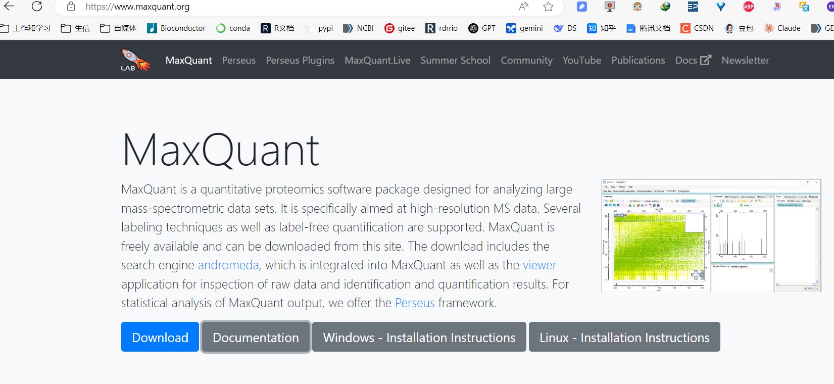 蛋白组学数据最常用的搜库软件是MaxQuant(https://www.maxquant.org/),可以进入该官网下载MaxQuant软件,maxquant是一个独立的windows零代码蛋白组搜库软件,网上也有比较多比较详细的图文教程和视频教程,我这里没有出maxcount的使用教程,建议大家在网上学习maxcount的教程来使用maxcount进行蛋白组的搜库处理。