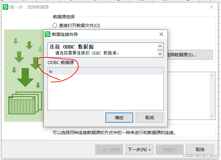 2、选择ODBC DSN,点击“选择数据源”按钮,选择IV这个数据库,点击“下一步”