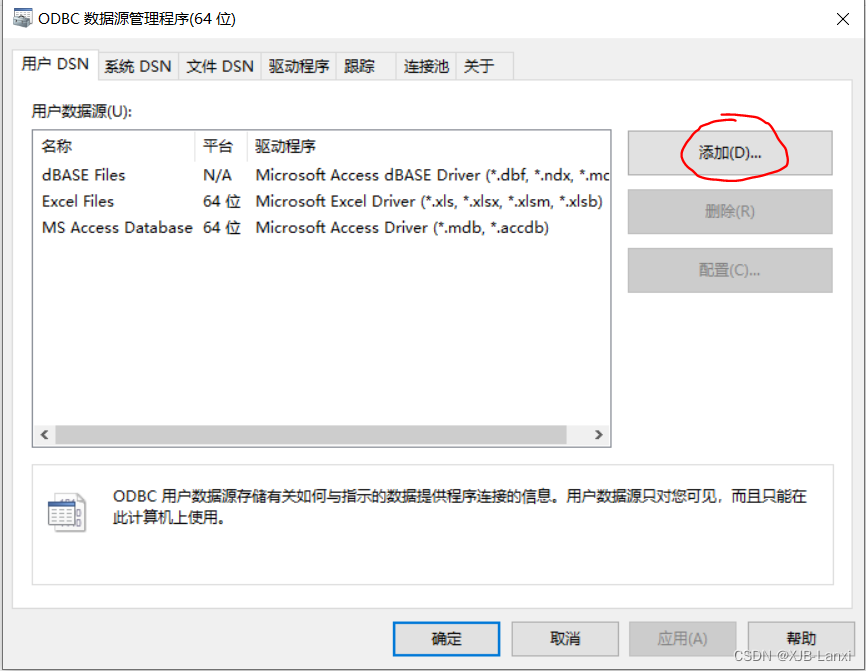 1、在电脑开始搜索栏中搜索ODBC,找到ODBC数据源(64位),打开ODBC数据源管理程序,点击右手边“添加”按钮。