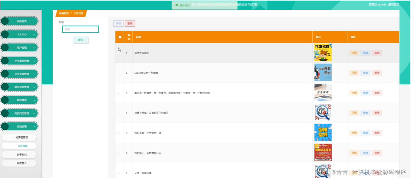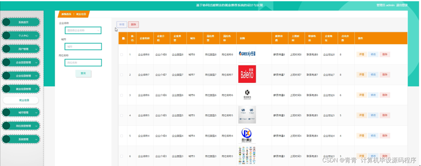 管理员点击就业信息管理,进入就业信息管理页面,输入企业名称、城市、岗位名称等可以查询相关信息,并进行新增、修改、删除等操作。如图5-12所示: