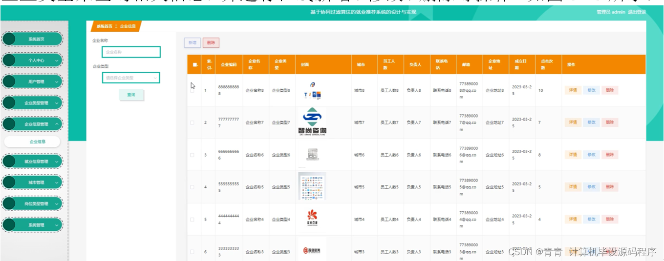 管理员点击企业信息管理,进入企业信息管理页面,可以通过输入企业名称、企业类型来查询相关信息,并进行在线新增、修改、删除等操作。如图5-13所示: