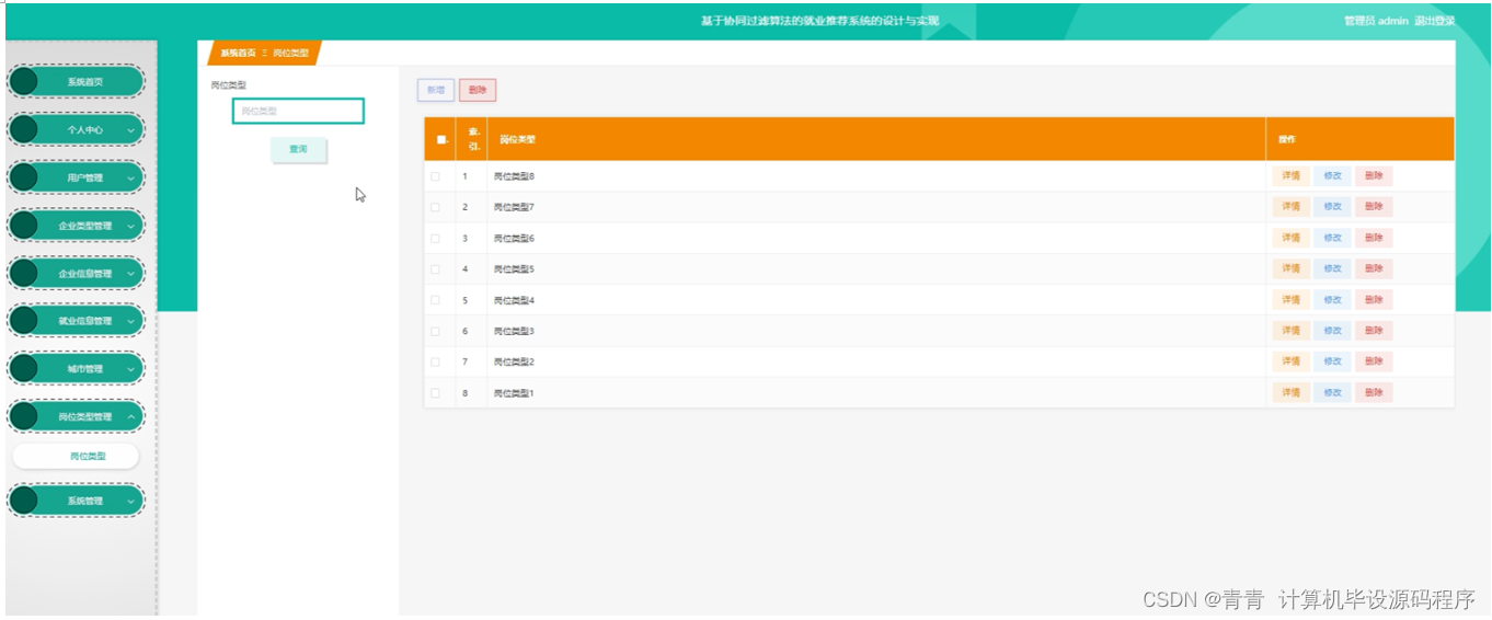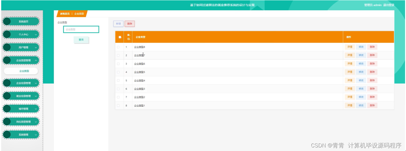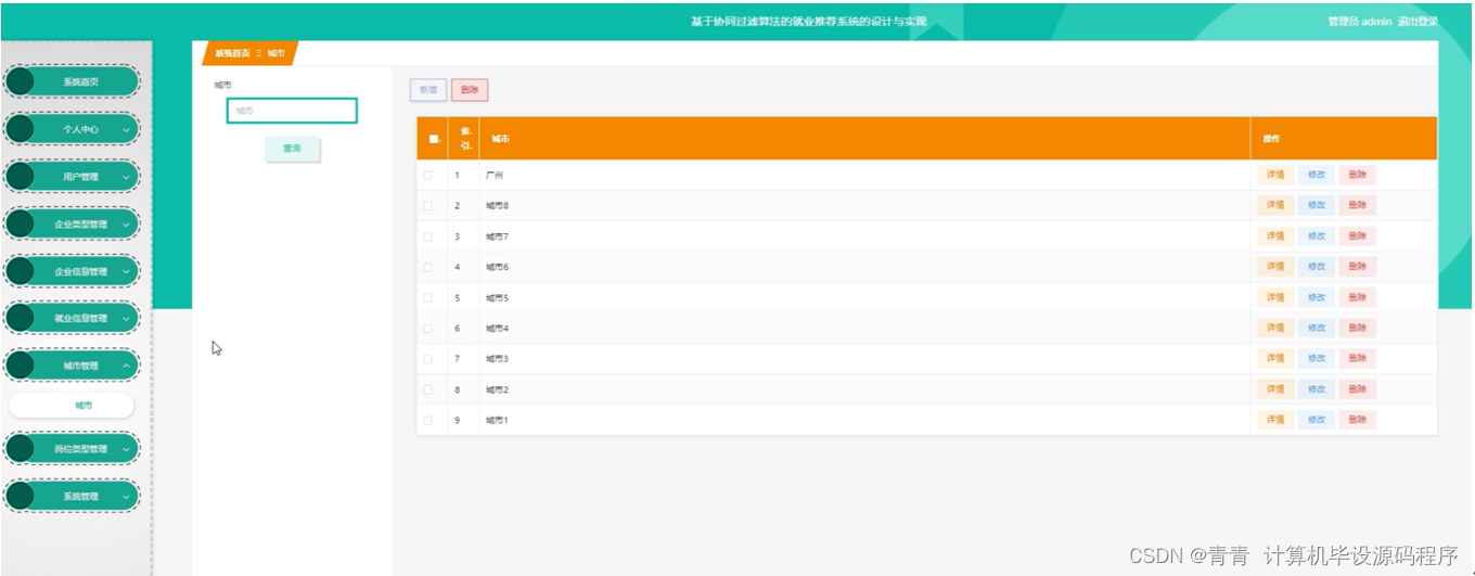 管理员可以对企业类型、城市信息、岗位类型进行修改、删除或新增的操作。其页面如下图所示: