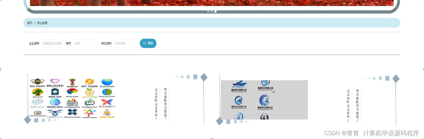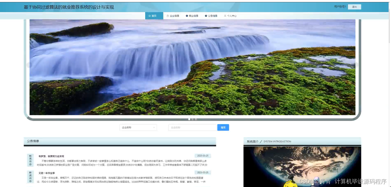当人们打开系统的网址后,首先看到的就是首页界面。在这里,人们能够看到首页、企业信息、就业信息、公告信息、个人中心等内容,还能看到系统的搜索栏、轮播图、推荐信息等。系统首页界面如图5-1所示: