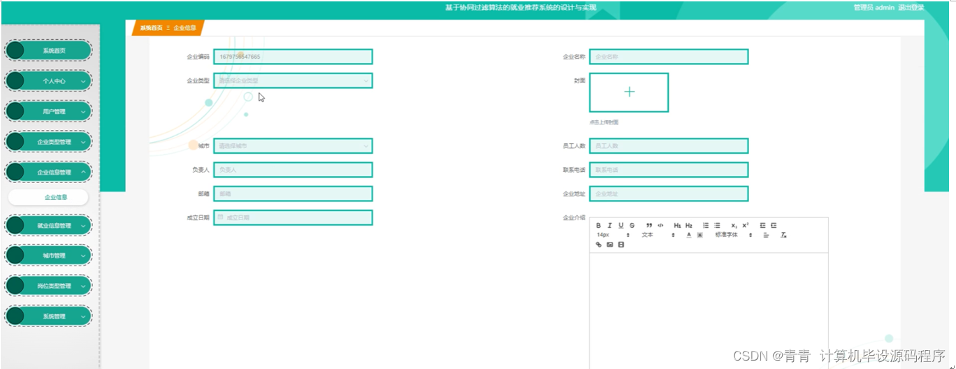 管理员进入主页面,主要功能包括对个人中心、用户管理、企业类型管理、企业信息管理、就行信息管理、城市管理、岗位类型管理、系统管理等进行操作。管理员功能主页面如图5-7所示: