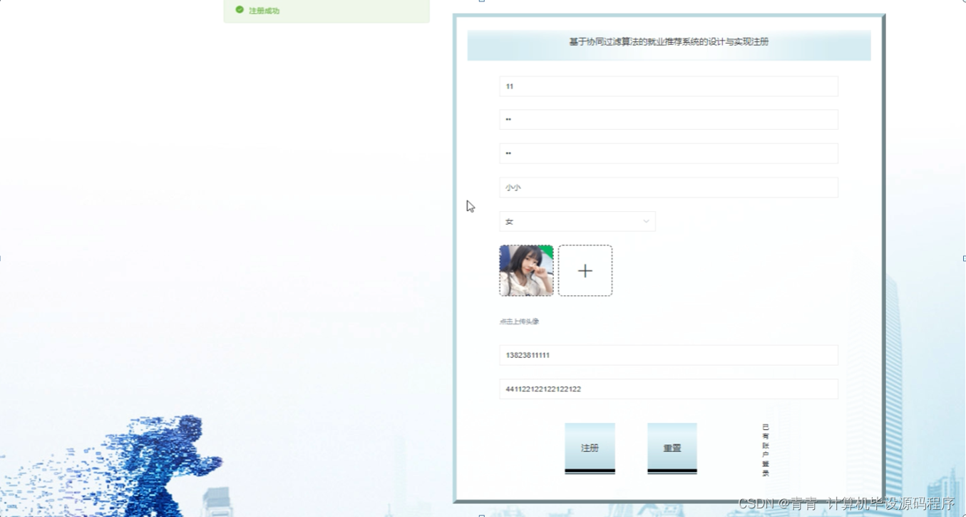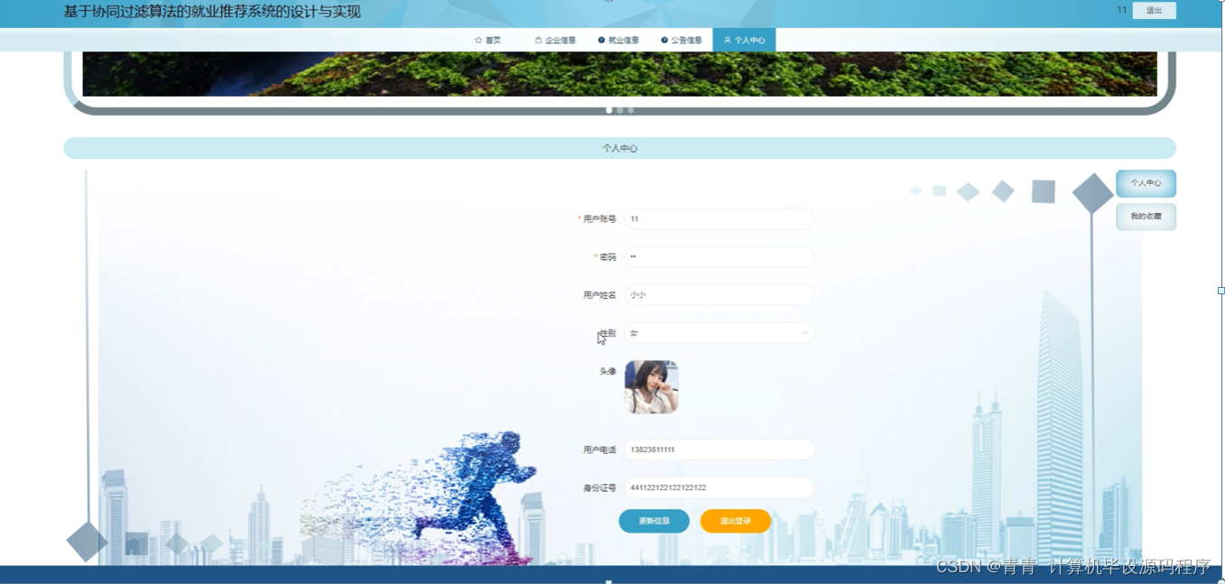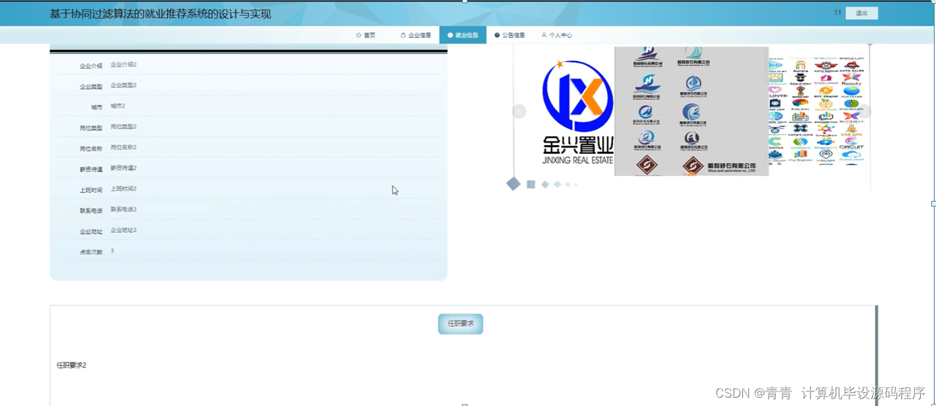 综上所述,基于协同过滤算法的就业推荐系统的设计与实现对于提高求职者的就业效果和企业的招聘效率具有重要意义。该系统可以帮助求职者快速找到适合自己的工作岗位,提供个性化的招聘推荐,促进企业的发展和人才流动。通过该系统的应用,求职者可以更加轻松地找到符合自己兴趣和能力的工作岗位,企业可以更好地满足人才需求,共同推动就业市场的发展,为求职者和企业提供更好的匹配和发展机会。
