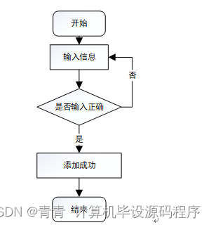 然后是添加信息的页面。进入该页面后,页面会出现一个提示框,示意操作者可以进行信息的添加,从而进行下一步的操作。用户输入想要添加的信息后提交,系统会对输入的内容进行检测。如果检测后输入的信息正确,则会出现“添加成功”的提示框,从而可以进行下一步操作;如果系统检测后检测到想要添加的信息不符合规范要求,则会提示报错,需要进行修改后重新添加。添加信息流程图如图3-2所示: