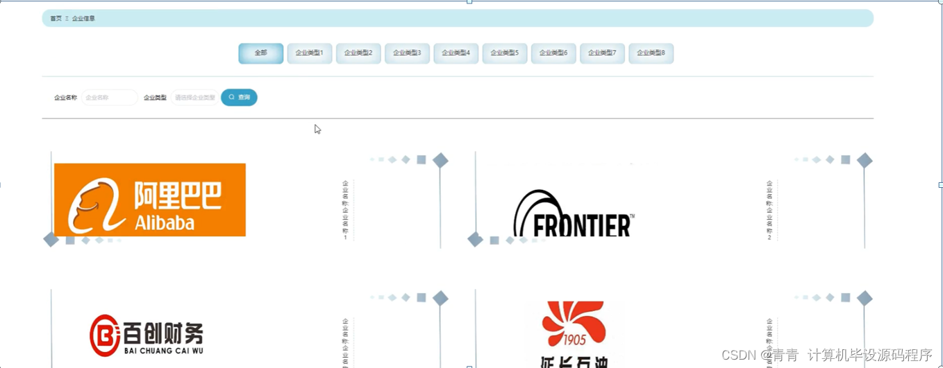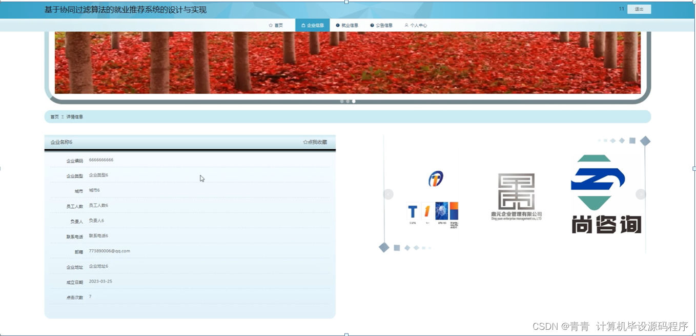用户通过注册、登录在就业推荐系统前台后,在企业信息页面的输入栏中输入企业名称、企业类型进行搜索,进入企业信息详情页面,查看企业信息详情,并进行收藏、评论等操作,具体页面如下图所示: