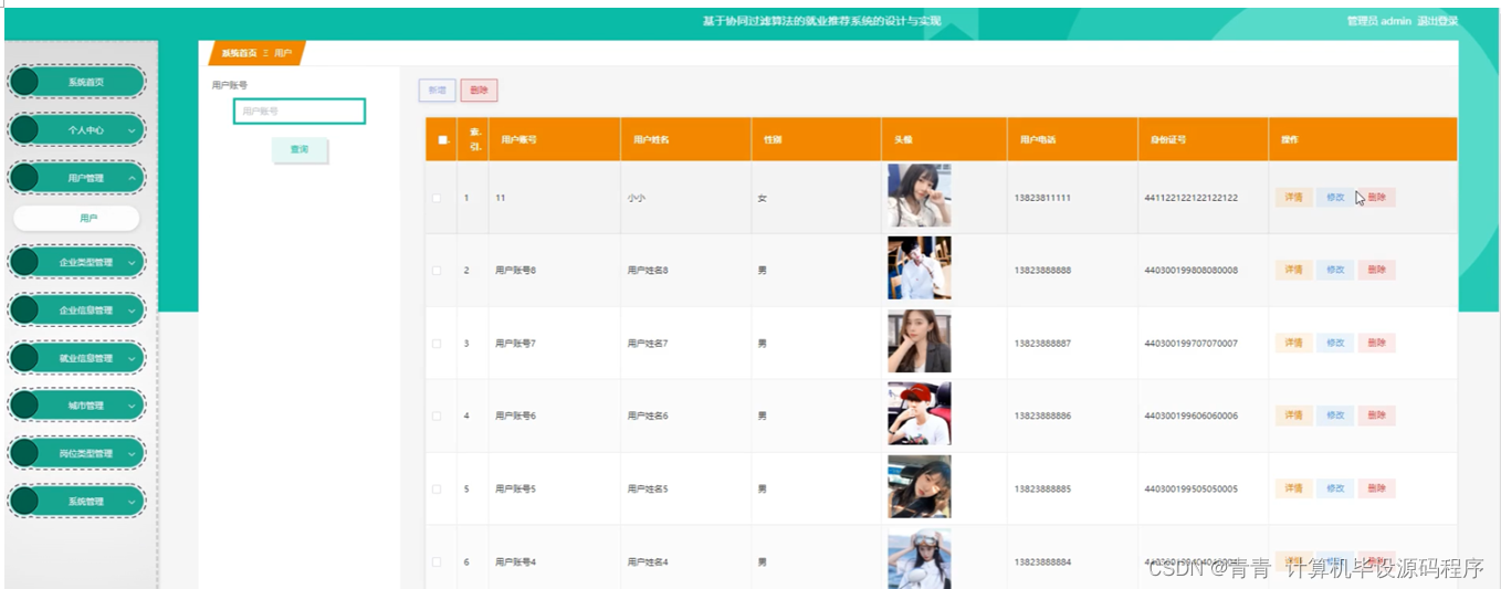 管理员点击用户管理,进入用户管理页面,输入用户账号可以查询用户详细信息,并进行在线新增、修改和删除等操作。如图5-8所示: