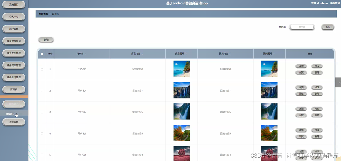 管理员登录系统后,可以对系统首页、个人中心、用户管理、健身课程管理、健身类型管理、健身视频管理、健身食谱管理、留言板、健身圈子、系统管理等进行相应的操作管理,如图5-8所示。
