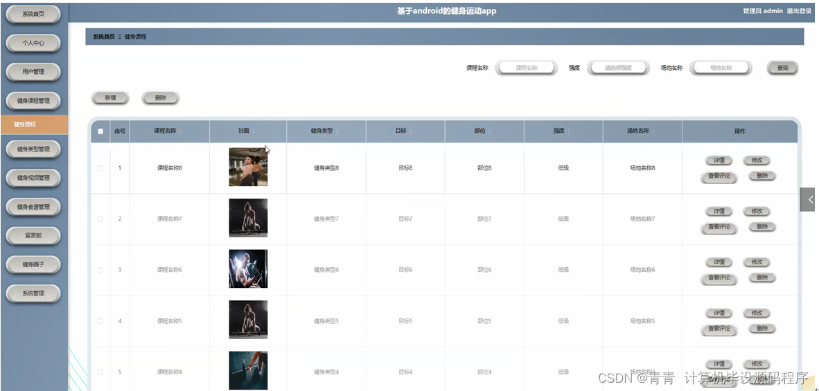 管理员点击健身课程管理,在健身课程管理页面输入课程名称、封面、健身类型、目标、部位、强度、场地名称等信息,然后进行查询、新增或删除健身课程等操作,如图5-10所示。