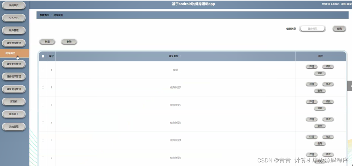 管理员点击健身类型管理,在健身类型管理页面输入健身类型等信息,然后进行查询、新增或删除健身类型等操作,如图5-11所示。