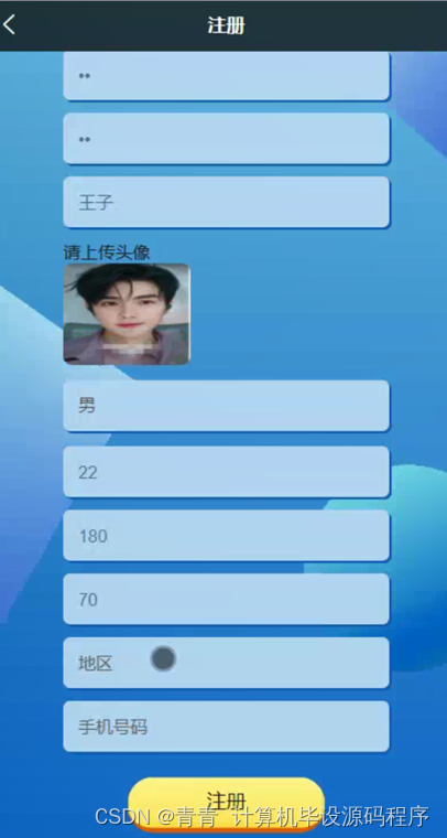 第一次使用本APP的使用者,首先是要进行注册,点击“注册”,然后就会进入到注册的页面里面,将用户信息录入注册表,确认信息正确后,系统才会进入登录界面,用户登录成功后可使用本APP所提供的所有功能。用户注册界面如图5-1所示。