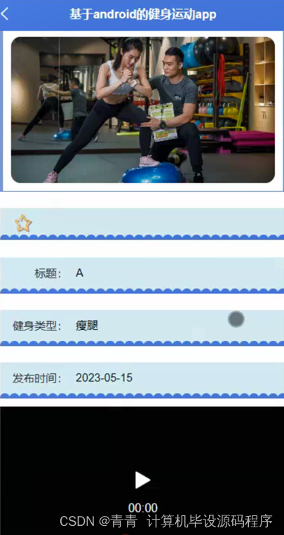 用户点击健身视频,在健身视频页面的搜索栏输入标题,进行查询,然后可以查看标题、健身类型、封面、教学视频、发布时间等信息,还可以点击收藏或者评论等。如图5-5所示。