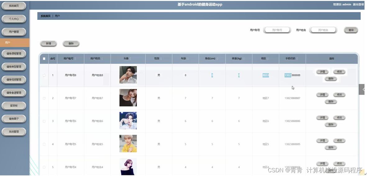 管理员点击用户管理,在用户管理页面输入用户账号、用户姓名、头像、性别、年龄、身高(cm)、体重(kg)、地区、手机号码等信息,然后进行查询、新增或删除用户信息等操作,如图5-9所示。