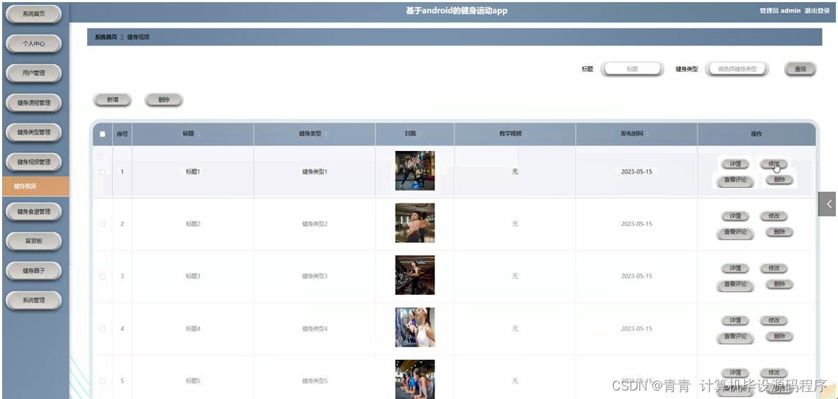 管理员点击健身视频管理,在健身视频管理页面输入标题、健身类型、封面、教学视频、发布时间等信息,然后进行查询、新增或删除健身视频等操作,如图5-12所示。