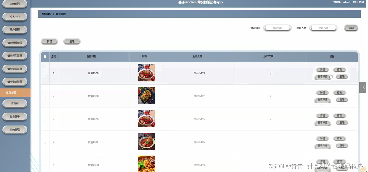 管理员点击健身食谱管理,在健身食谱管理页面输入食谱名称、封面、适合人群、点击次数等信息,然后进行查询、新增或删除健身食谱等操作,如图5-13所示。
