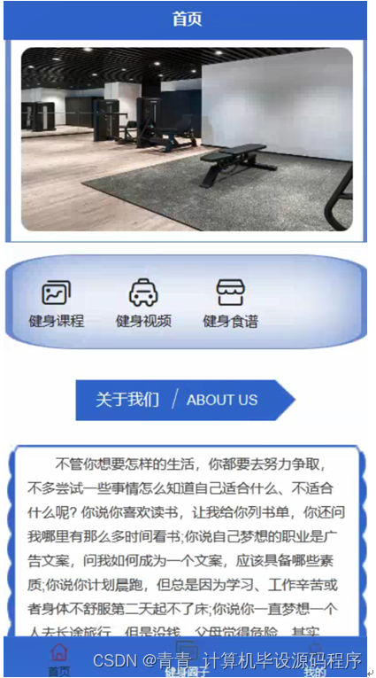APP首页是用户注册登录后进入的第一个界面,用户可通过APP端首页的最下面的那一行导航栏中的“首页、健身圈子、我的”进入到相应的网页进行操作;点击“我的”进入我的页面,在我的页面可以对在线咨询、我要发帖、我的发帖、留言板等进行详细操作。APP首页界面如图5-3所示。