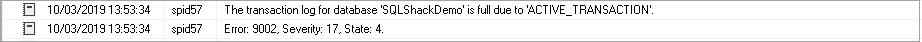 In the output, you can see that the transaction log for database is full due to Active Transaction. It inserted only 2949 rows due to a limited maximum transaction log size.