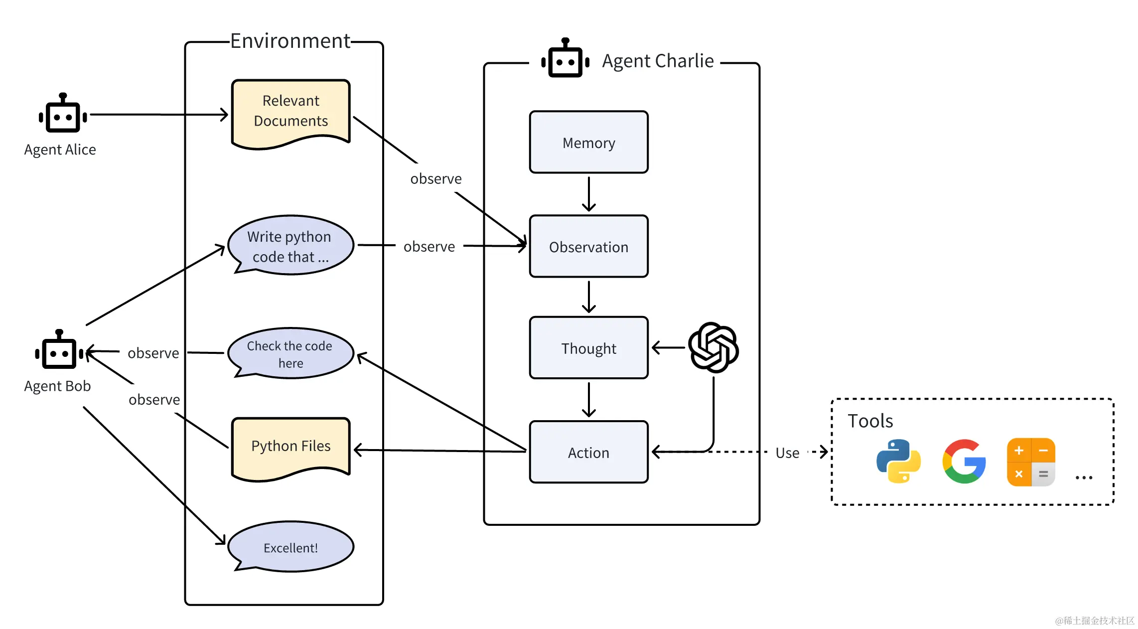 2.观察:这是智能体的感知机制,使其能够感知其环境。智能体可能会接收来自另一个智能体的文本消息、来自监视摄像头的视觉数据或来自客户服务录音的音频等一系列信号。这些观察构成了所有后续行动的基础。