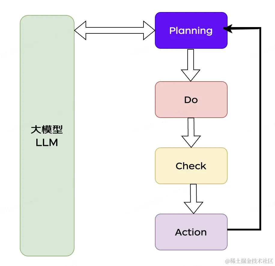 PDCA 循环是人日常做事思维模型,大模型是否可以像人一样,让大模型代替人的工作。因而,智能体应运而生,让大模型具备执行能力。