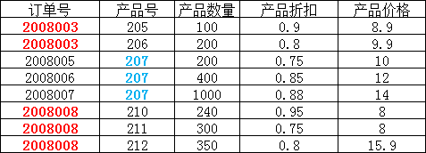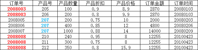 但可以发现,产品数量、产品折扣、产品价格与“订单号”和“产品号”都相关,但是订单金额和订单时间仅与“订单号”相关,与“产品号”无关,