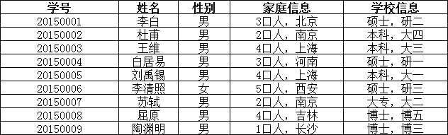 在上面的表中,“家庭信息”和“学校信息”列均不满足原子性的要求,故不满足第一范式,调整如下:
