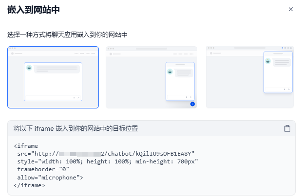 点击“发布”即可发布应用,应用发布后,可以通过调用api的形式来调用此应用,也可以在你现有网站中通过嵌入代码的形式引用此应用