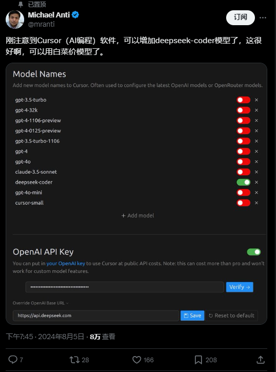 当然不止于此。你甚至可以自己配置模型。包括不限于Cluade3.5 Sonnet、GPT-4、deepseek等模型。