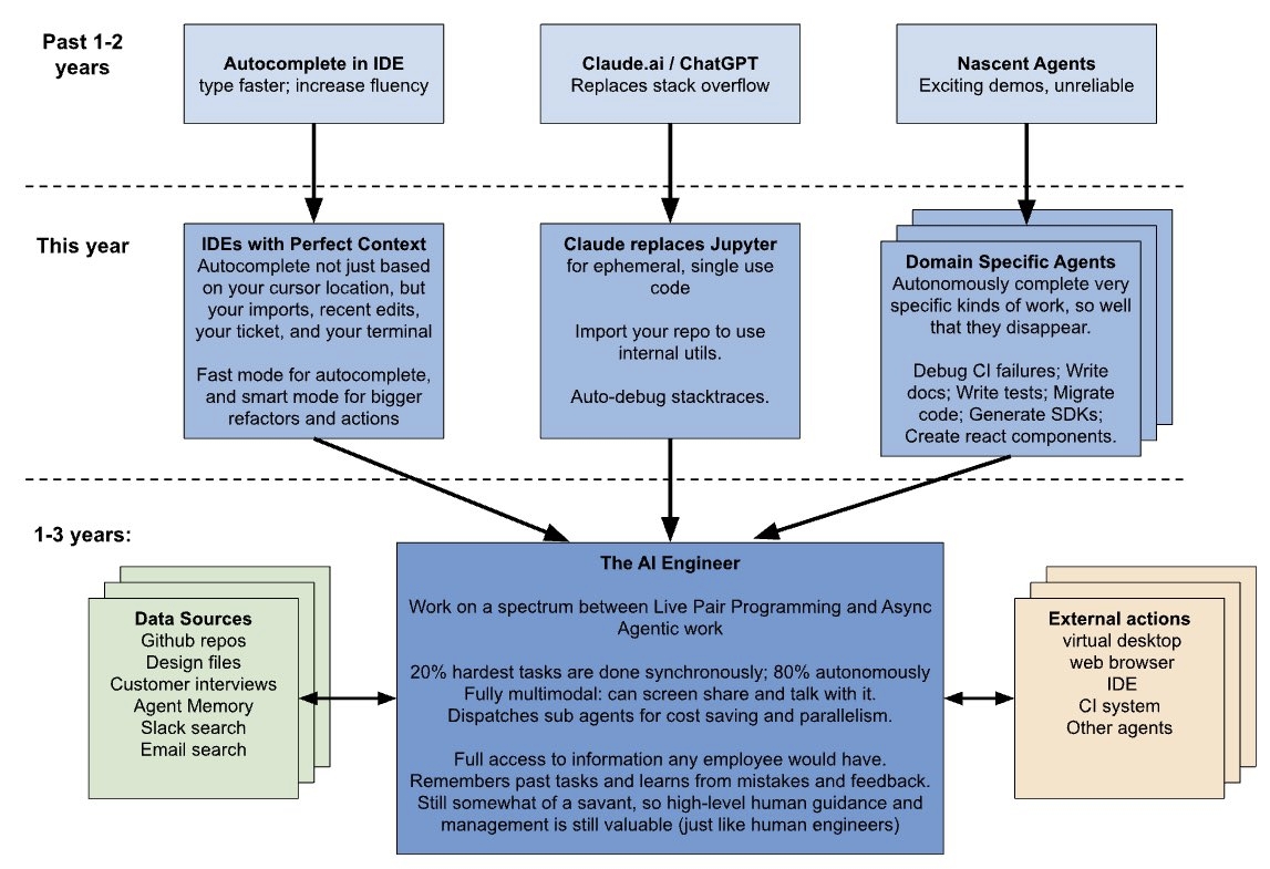 现在:Devin/Cursor 感知整个 Repo 上下文,搜索代码、生成多个文件、自动调试