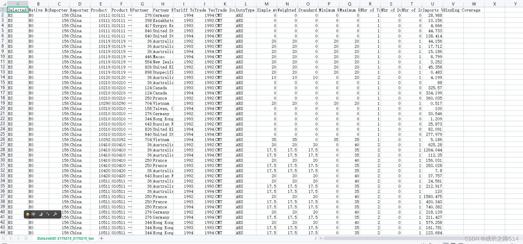 (1)中国双边进口关税1、数据来源:世界银行WITS数据库2、时间跨度:1996-20193、区域范围:全国4、指标说明:加权平均关税是数据库里面原有的,具体计算方式请去数据库查询。这份数据最终来源是来自世界银行WITS数据库。但是下载来源有两个 WTO数据库和TRAINS数据库。WTO数据库中更新到2017年,TRAINS数据库更新到2019年。这个数据表比较大,excel可能不能显示所有数据,